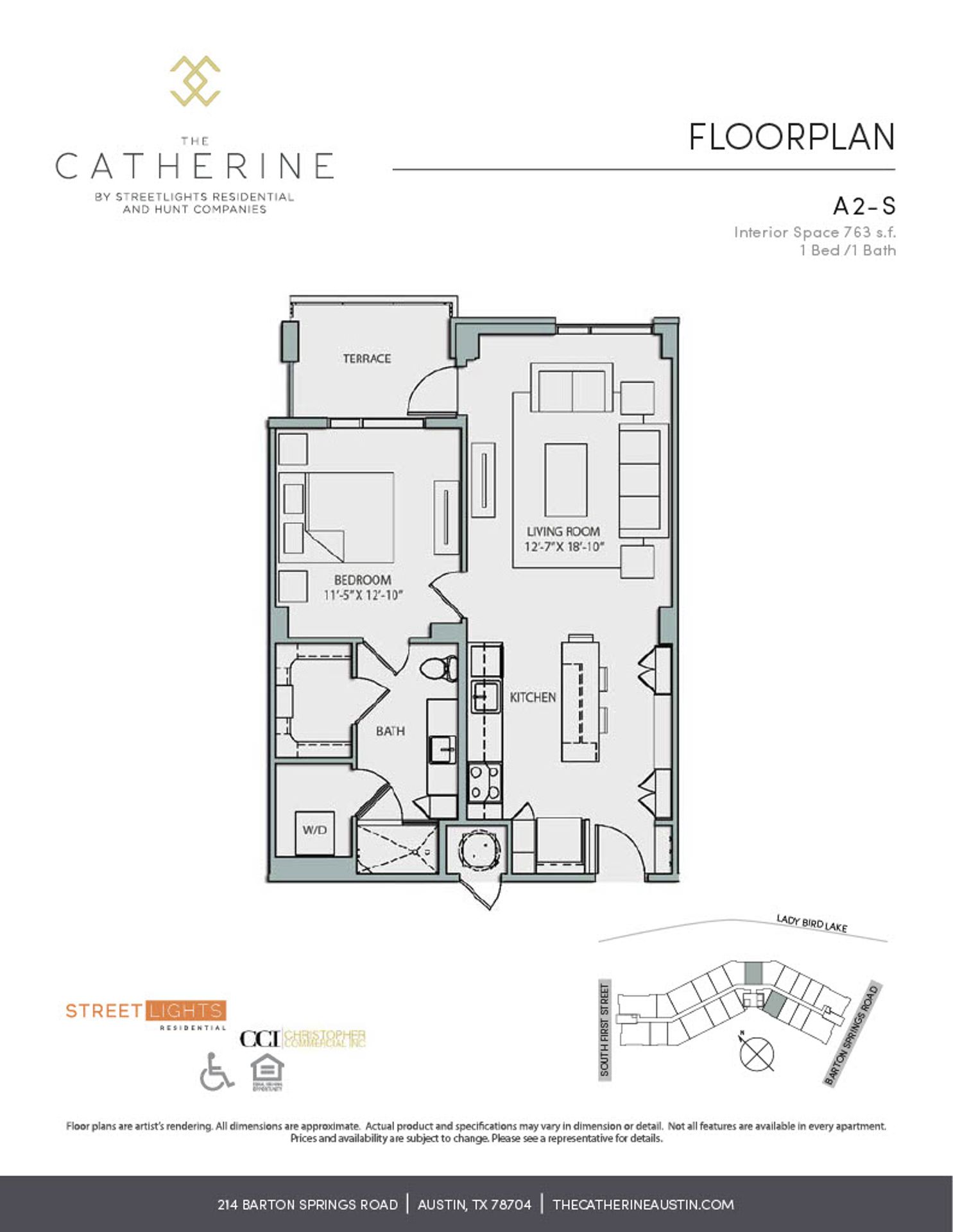 The Catherine presents the A2s floor plan! This spectacular apartment is 1 bedroom with 1 bathroom at 763 square feet. The incredible A2s has a wonderful open concept floor plan, where the kitchen and living room blend together to make the perfect entertaining space! Gorgeous granite countertops in both the kitchen and bathroom will impress you! Stainless steel appliances in the kitchen and a great wall with extra cabinets and display shelves to really make this apartment your home with decorations and pictures! The BEST part about the A2s though, is the stunning glass rain shower in the bathroom! This shower is the definition of luxury and unique to this floor plan! Don't forget about those incredible floor-to-ceiling windows that bring in all the light, PLUS a spacious terrace for enjoying the Austin sun! You will be amazed at the size of the walk-in closet, laundry room (with tons of room for storage) and the blackout blinds in the bedroom for an amazing night’s sleep!
